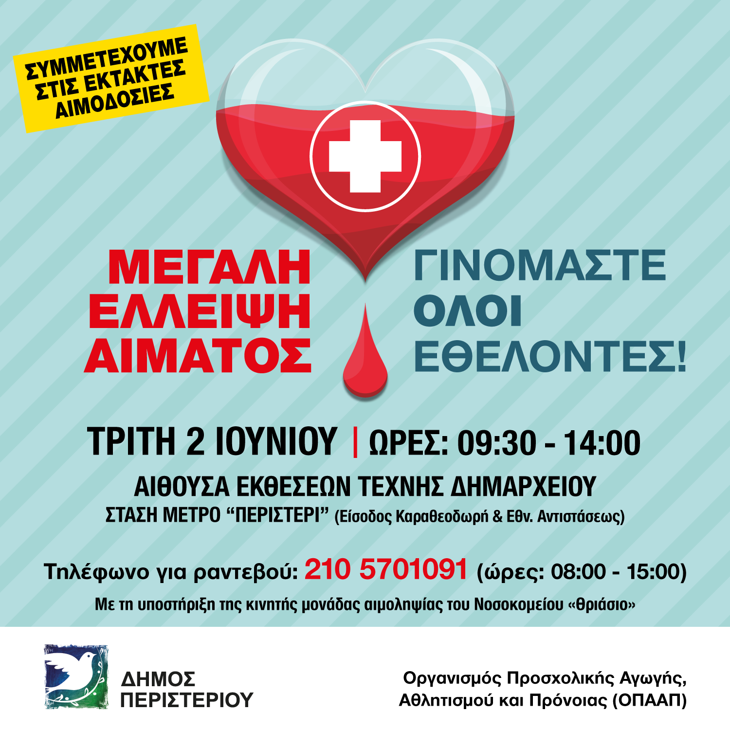 O Οργανισμός Προσχολικής Αγωγής Αθλητισμού και Πρόνοιας του Δήμου Περιστερίου (ΟΠΑΑΠ) διοργανώνει έκτακτη Εθελοντική Αιμοδοσία, με τη υποστήριξη της κινητής μονάδας αιμοληψίας του Νοσοκομείου «Θριάσιο»