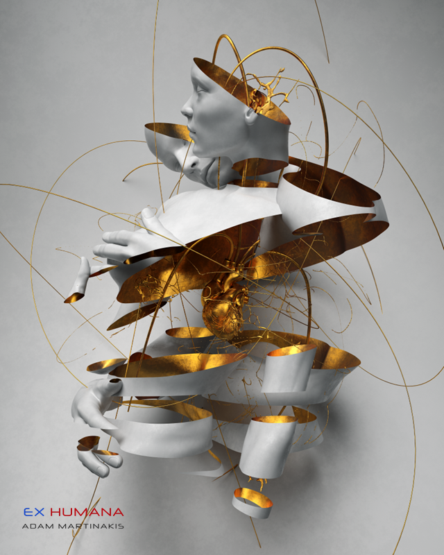 Η έκθεση, με τίτλο EX HUMANA, αντλεί έμπνευση από τον άνθρωπο και την τεχνολογία, συμπυκνώνοντας το σύγχρονο παράδοξο: