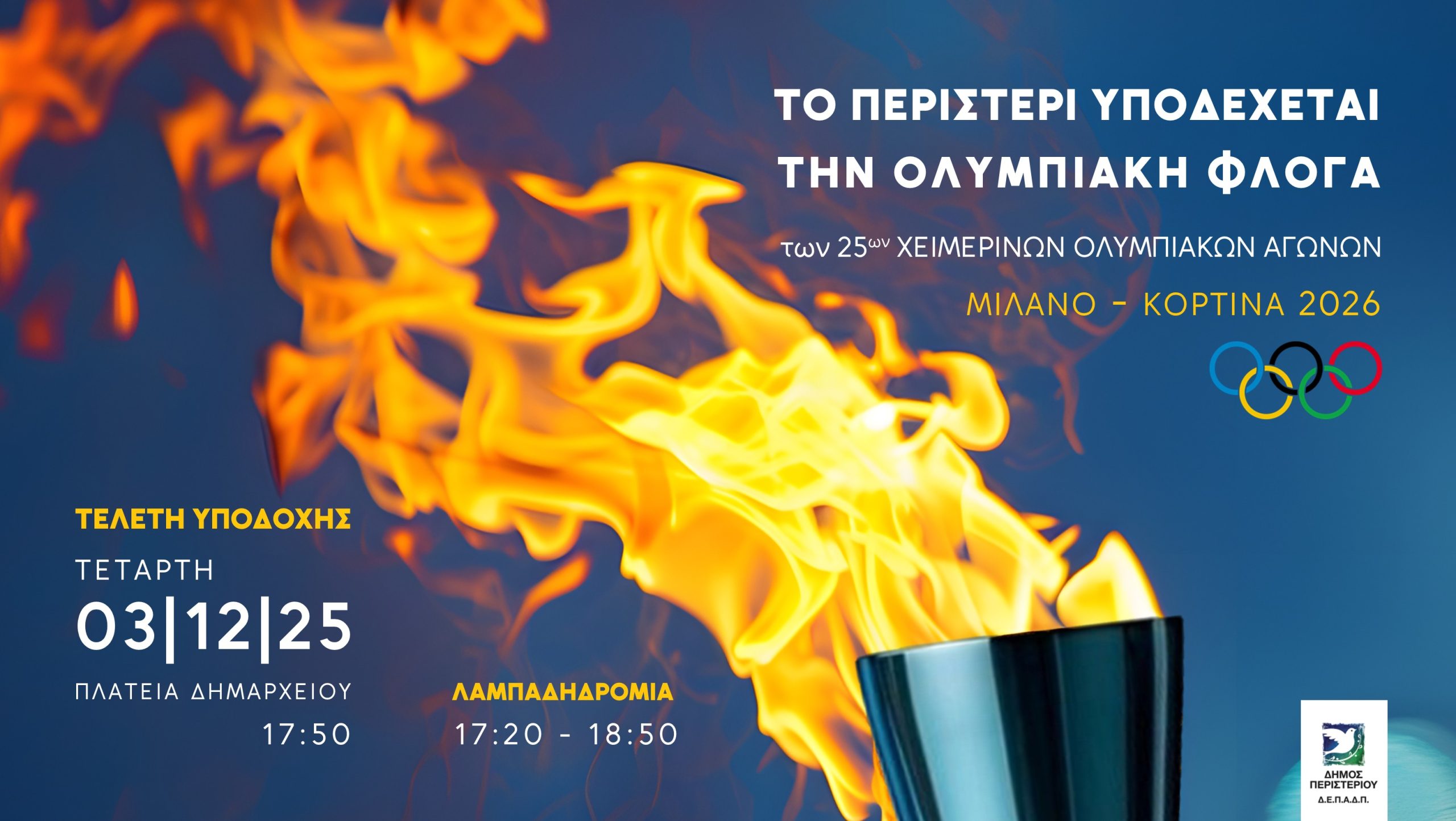 Η πόλη του Περιστερίου θα έχει την τιμή να φιλοξενήσει και πάλι το παγκόσμιο σύμβολο ειρήνης, ενότητας και ευγενούς άμιλλας, στο πλαίσιο της διαδρομής της προς τους 25ους Χειμερινούς Ολυμπιακούς Αγώνες Μιλάνο – Κορτίνα ντ’ Αμπέτσο 2026.