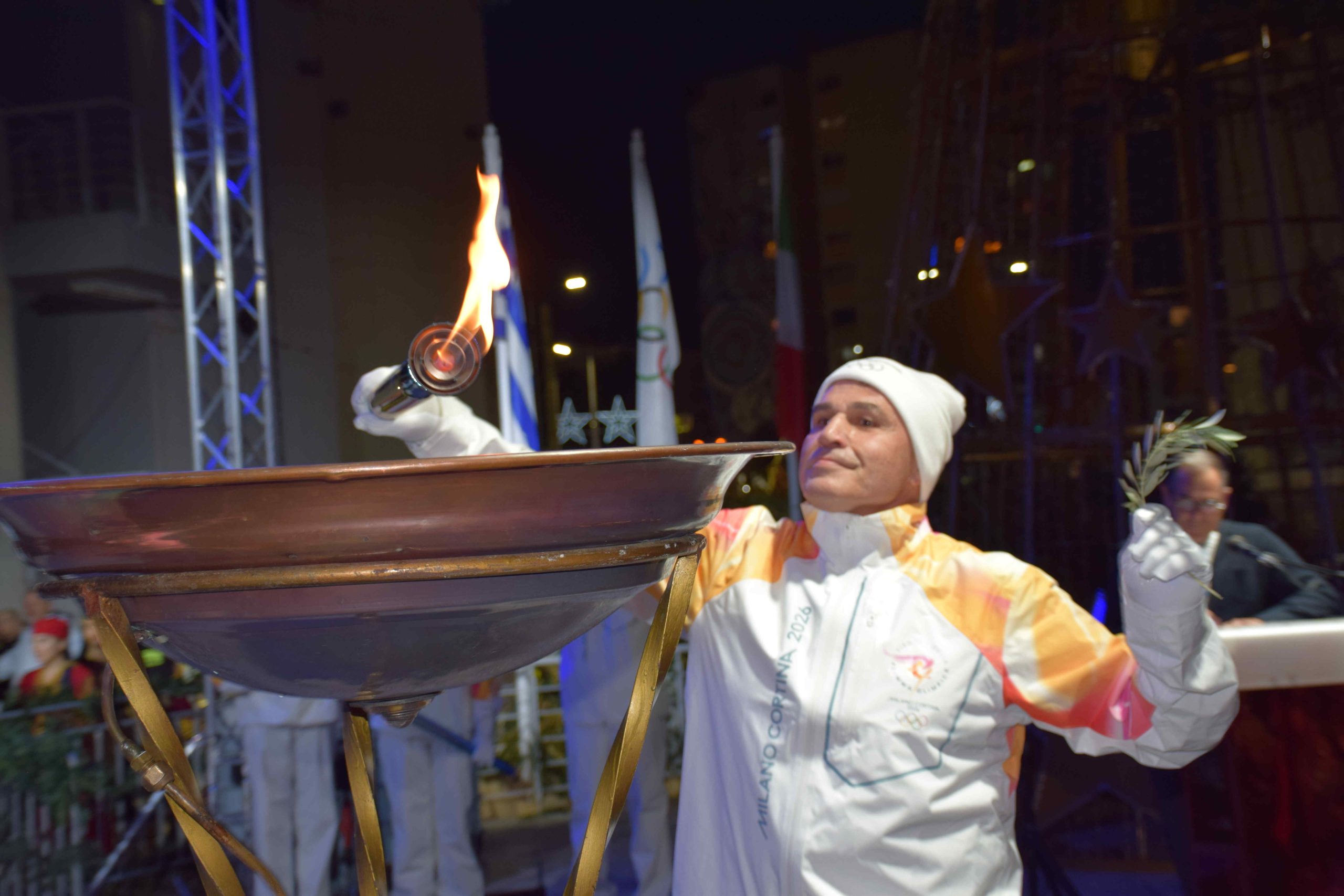 Η Ολυμπιακή Φλόγα έφτασε στο Δημαρχιακό Μέγαρο της πόλης με τον Περιστεριώτη Ολυμπιονίκη Γιώργο Στεφανόπουλο, ο οποίος άναψε τον βωμό, σηματοδοτώντας την επίσημη έναρξη της τελετής. Αμέσως μετά ακούστηκαν, με απόλυτη σειρά, ο Ολυμπιακός Ύμνος, ο Εθνικός Ύμνος της Ιταλίας και ο Εθνικός Ύμνος της Ελλάδας, αποδομένοι από τη Φιλαρμονική Ορχήστρα του Δήμου Περιστερίου.