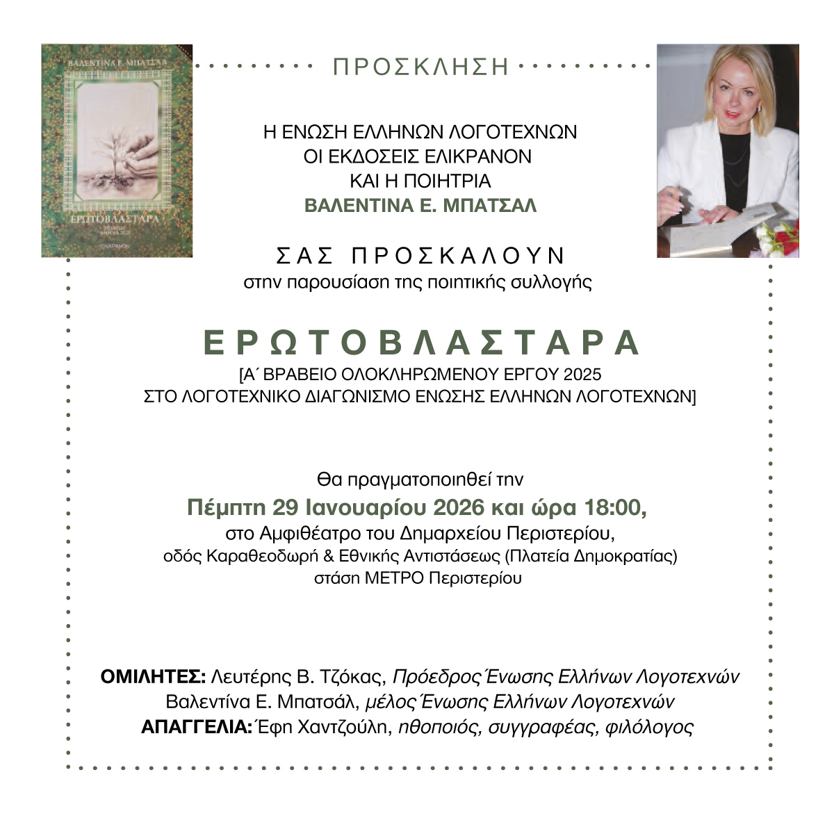 Η Ένωση Ελλήνων Λογοτεχνών, οι Εκδόσεις Ελικράνον και η ποιήτρια Βαλεντίνα Ε. Μπατσάλ σας προσκαλούν στην παρουσίαση της ποιητικής συλλογής «Ερωτοβλαστάρα», που τιμήθηκε με Α’ Βραβείο Ολοκληρωμένου Έργου 2025 στον Λογοτεχνικό Διαγωνισμό της Ένωσης Ελλήνων Λογοτεχνών.