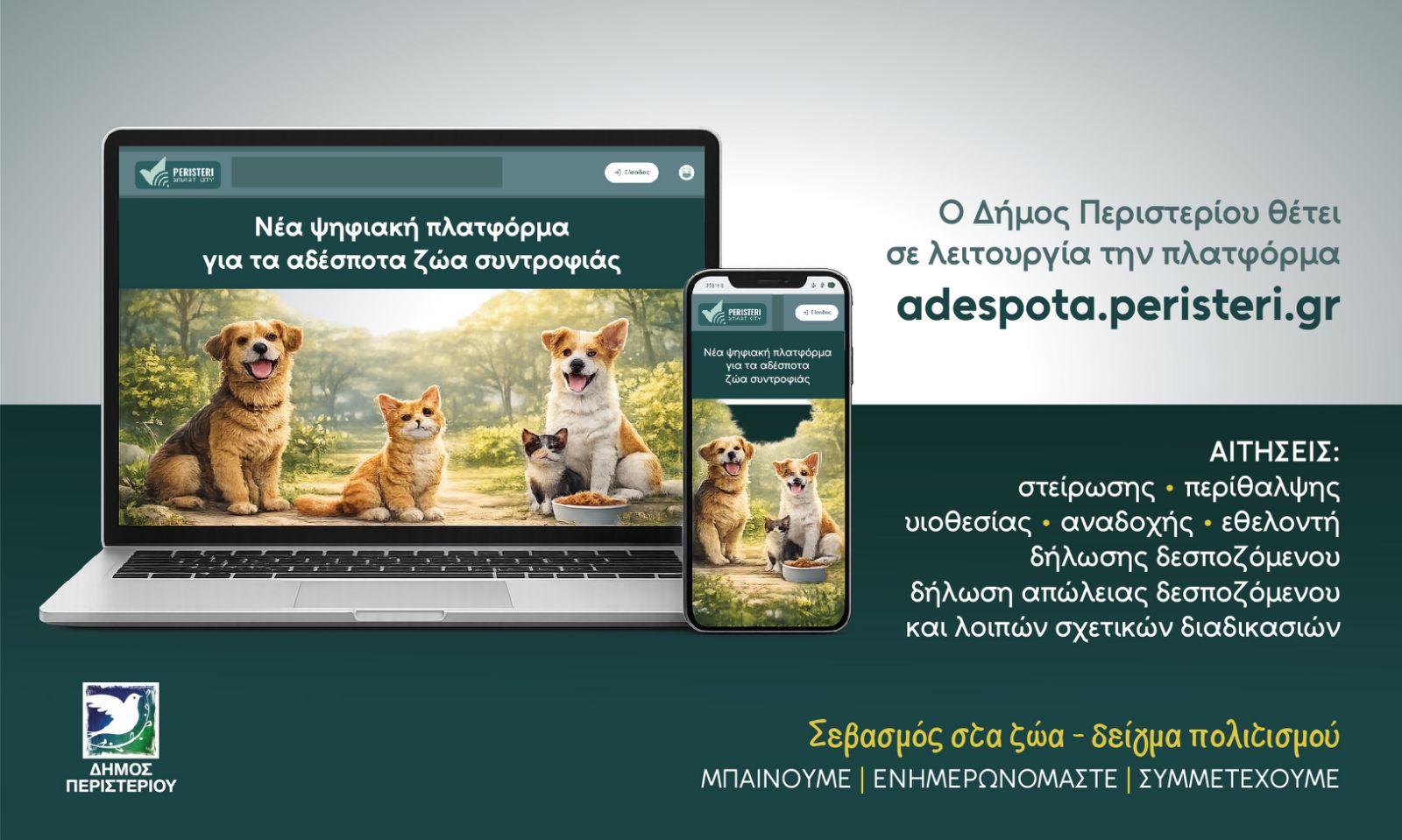 Ο Δήμος Περιστερίου ενεργοποιεί τη νέα πλατφόρμα adespota.peristeri.gr για την προστασία και διαχείριση των αδέσποτων ζώων συντροφιάς