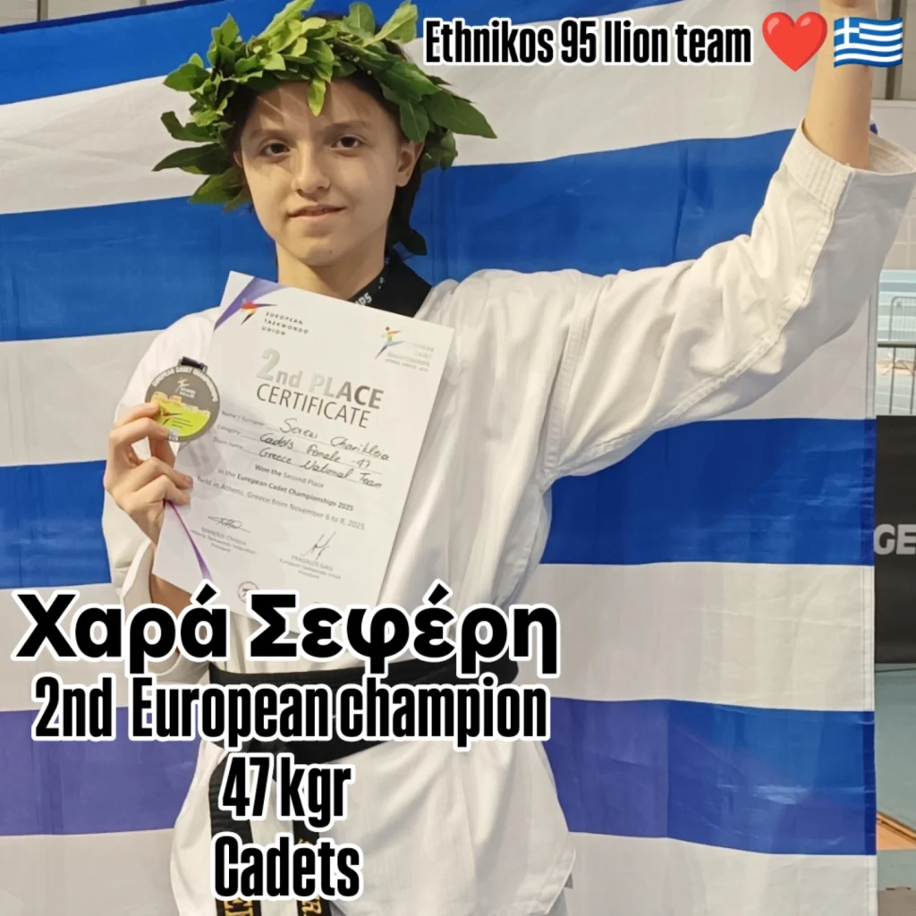 Η Χαρίκλεια Σεφέρη κατέκτησε τη 2η Πανευρωπαϊκή θέση στην κατηγορία -47 κιλών Κορασίδων, εκπροσωπώντας επάξια την Εθνική Ομάδα, στο Ευρωπαϊκό Πρωτάθλημα που διεξήχθη στην Αθήνα από 6 έως 8 Νοεμβρίου 2025, επιβεβαιώνοντας τόσο το υψηλό επίπεδο του ελληνικού taekwondo όσο και το αγωνιστικό της ήθος.