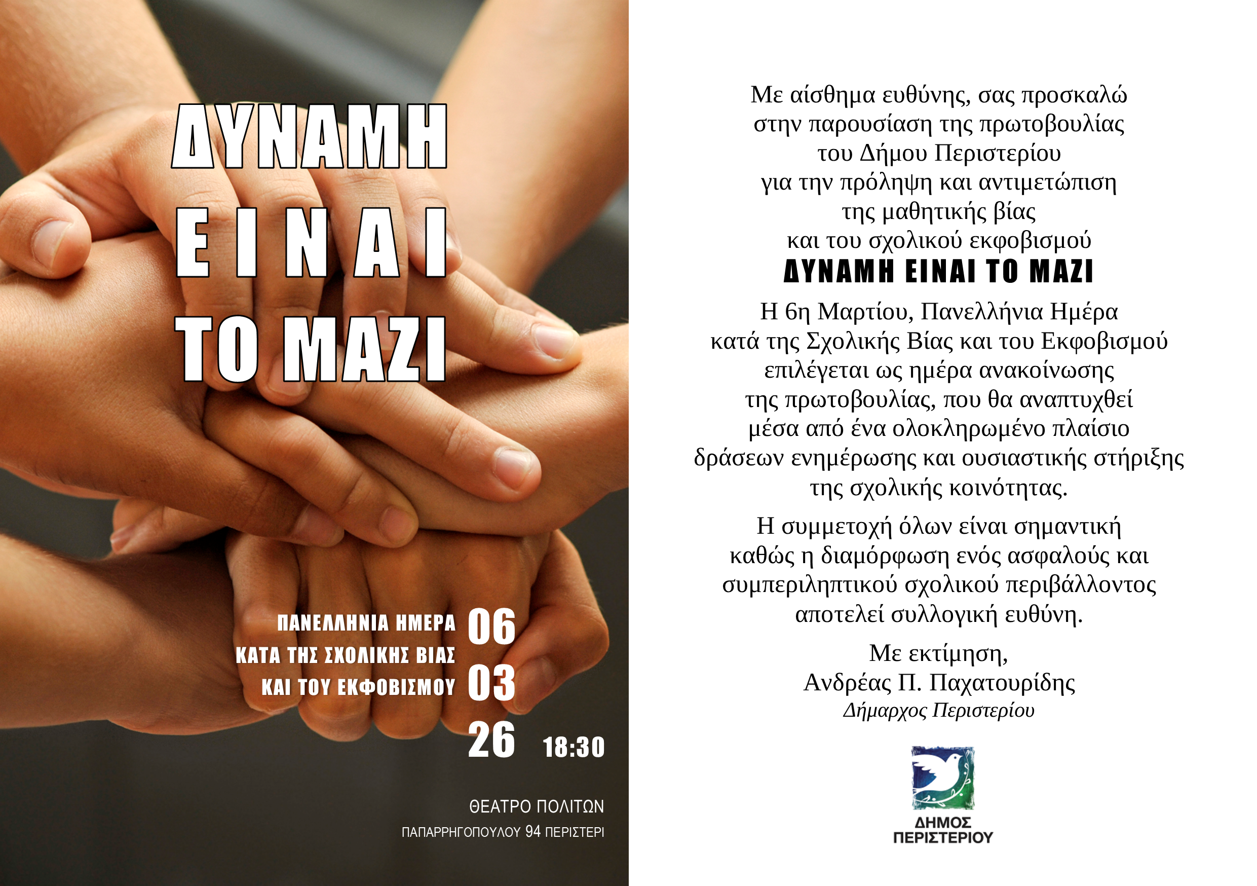 Πρωτοβουλία «Δύναμη είναι το Μαζί» του Δήμου Περιστερίου για την πρόληψη και αντιμετώπιση της σχολικής βίας