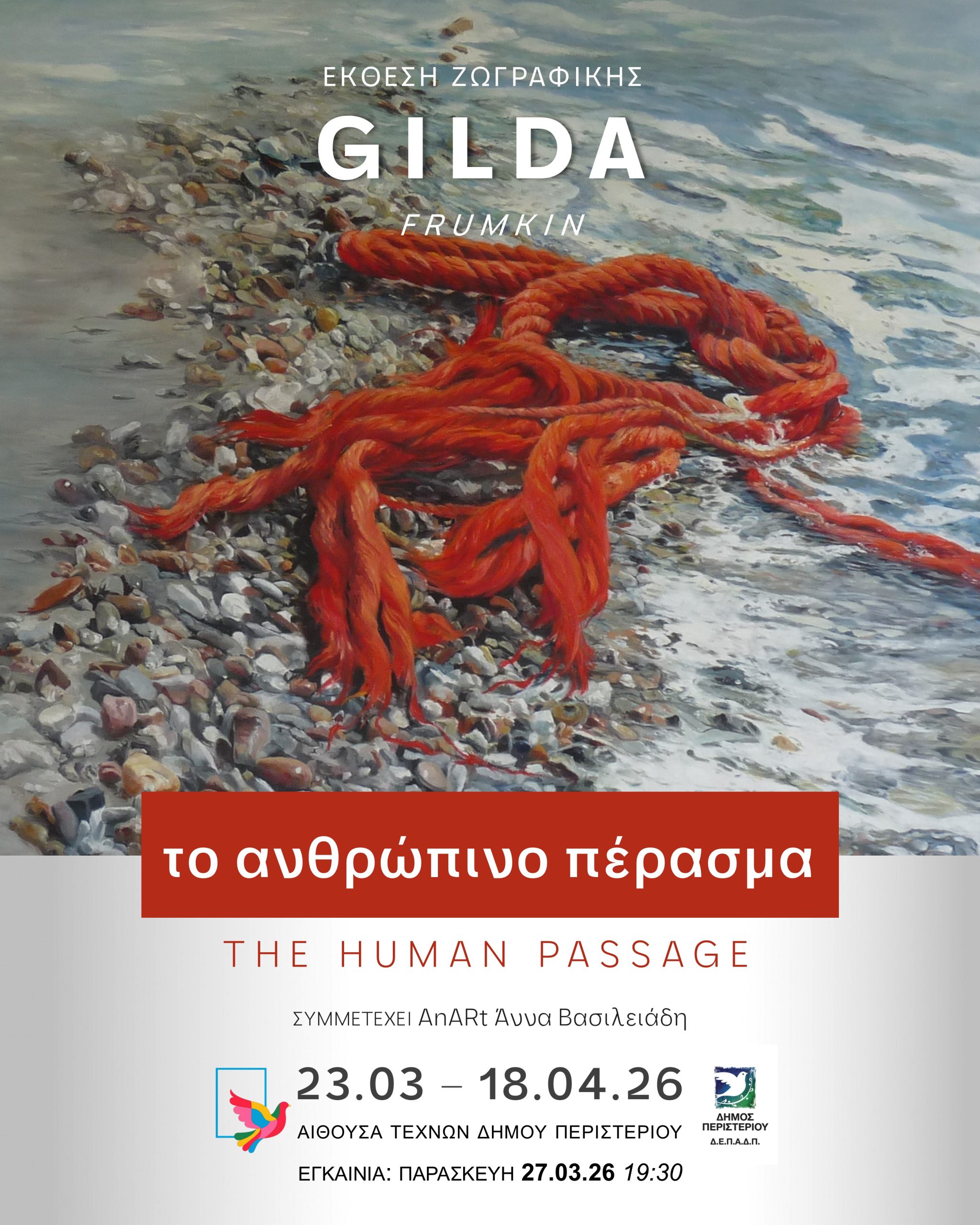Ο Δήμαρχος Περιστερίου, Ανδρέας Π. Παχατουρίδης, σας προσκαλεί στην έκθεση ζωγραφικής της εικαστικού Gilda Frumkin με τίτλο «Το Ανθρώπινο Πέρασμα – The Human Passage», η οποία θα φιλοξενηθεί στην Αίθουσα Τέχνης του Δημαρχιακού Μεγάρου (στάση Μετρό «Περιστέρι»), από 23 Μαρτίου έως 18 Απριλίου 2026.